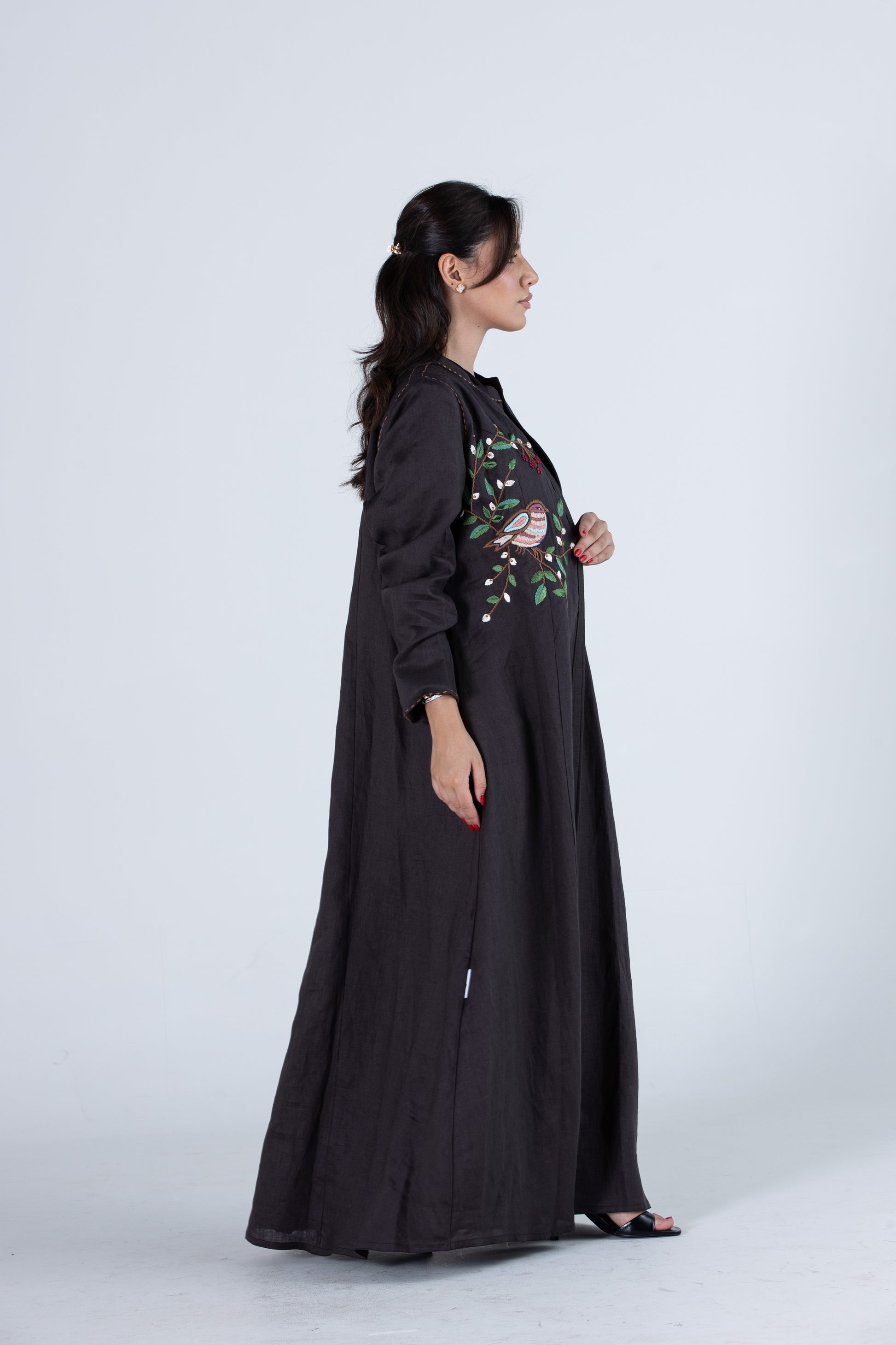 BIRD is a luxurious abaya crafted from high-quality linen fabric and lined with exquisite chiffon to impart a touch of sophistication and softness. This abaya features meticulous details including hand-embroidery on the collar and sleeves, inspired by the beauty of nature with vibrant colors, complemented by hand embroidery and beads for a unique artistic touch. The design boasts a carefully tailored A-line silhouette, combining comfort and elegance, making it ideal for summer.