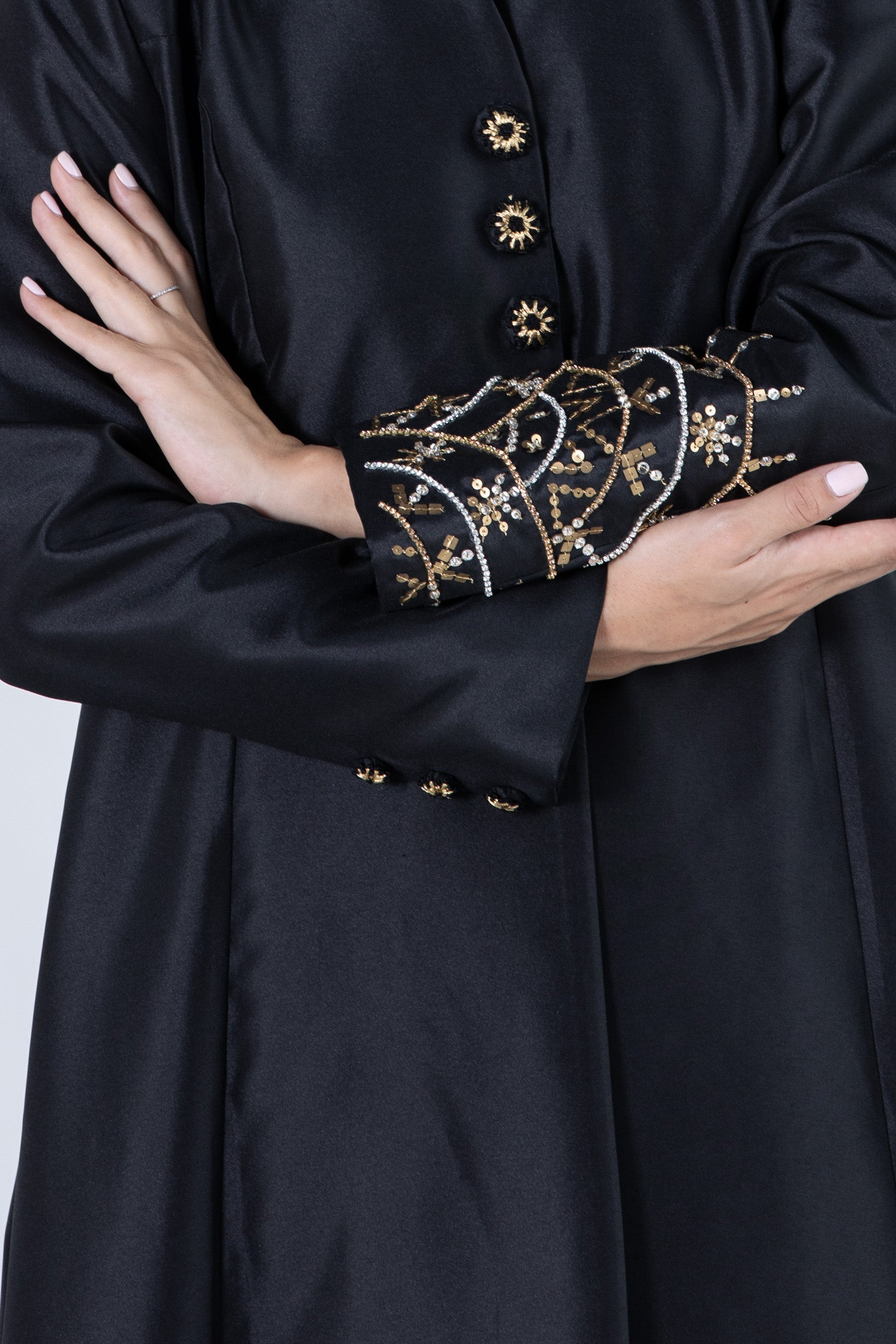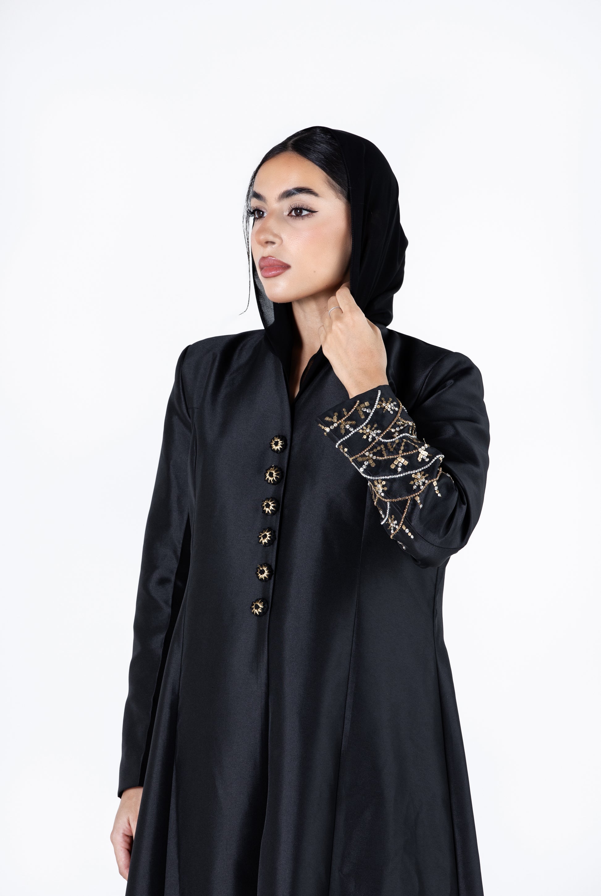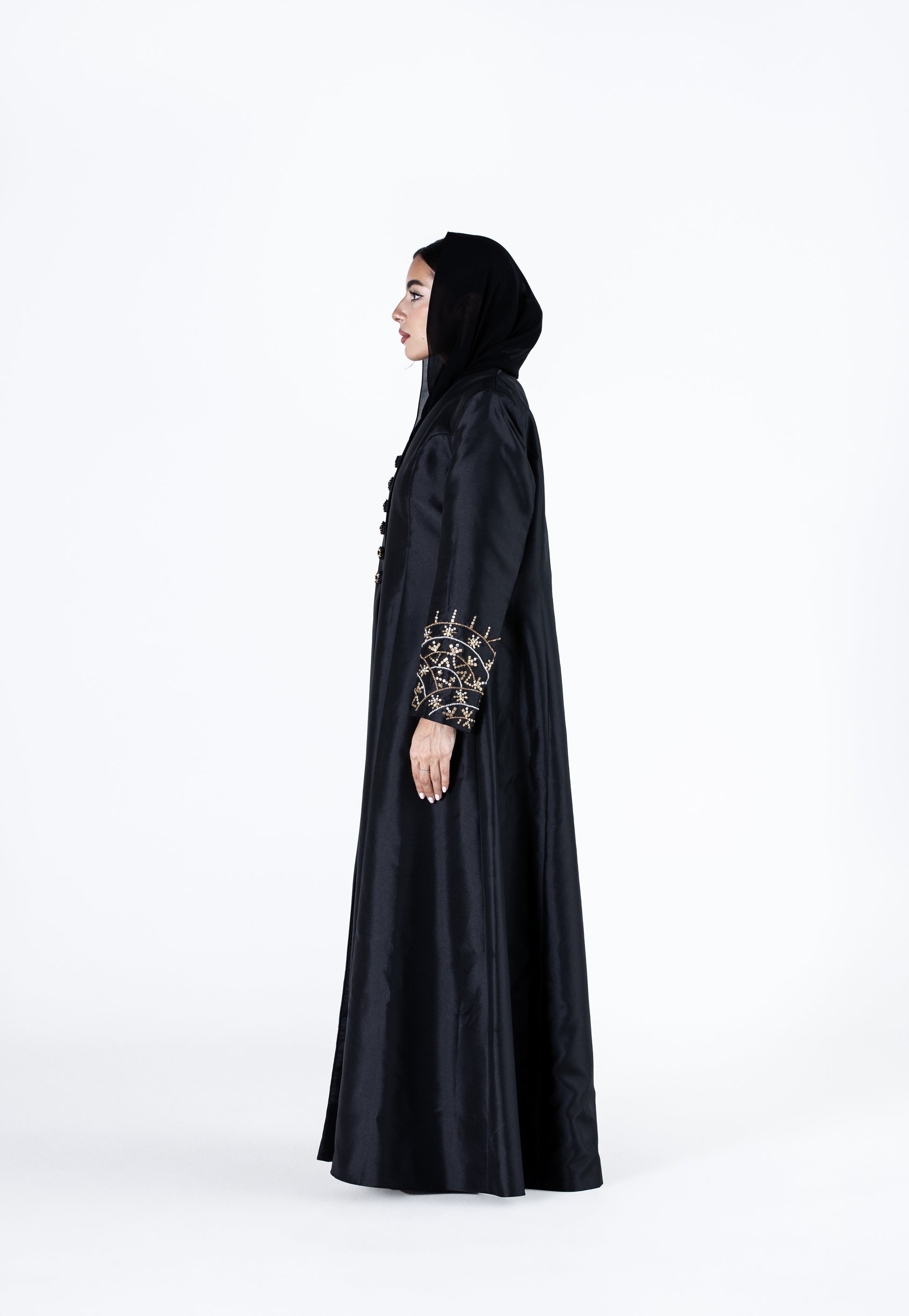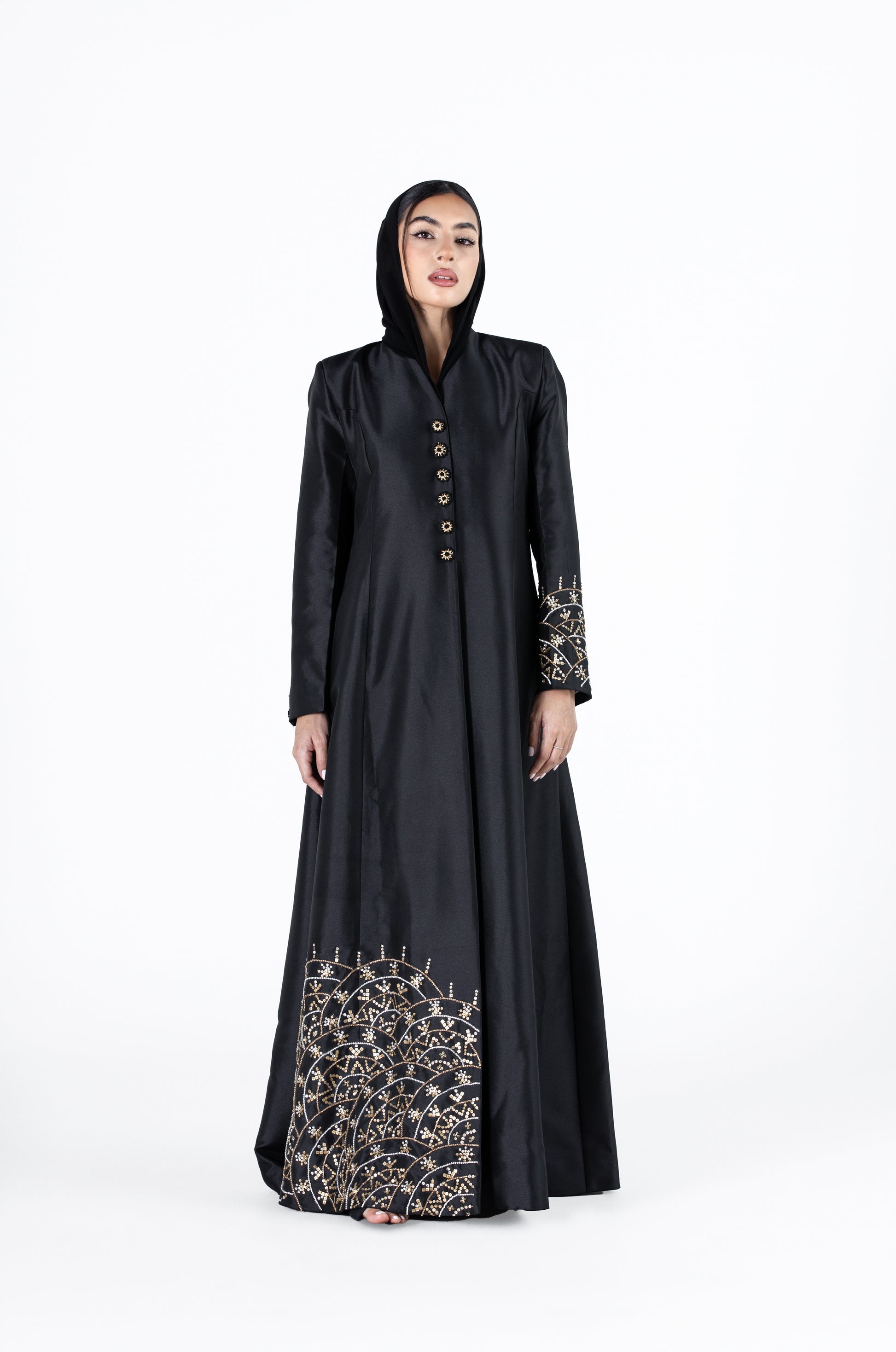 The "Indian Petal" abaya embodies the luxury and beauty of traditional Indian artistry with an elegant contemporary design. Made from luxurious taffeta fabric with a refined sheen, it is adorned with gold and silver embroidery and high-quality crystals inspired by traditional Indian motifs, adding a regal touch. The abaya features fitted sleeves embellished with gold and silver embroidery, crystals, and embroidered buttons. The elegant curved design reflects sophistication. The handcrafted embroidery showcases high skill and craftsmanship, making each piece unique. The "Indian Petal" is perfect for special occasions such as parties and weddings, making it an excellent choice for the woman seeking elegance and distinction.