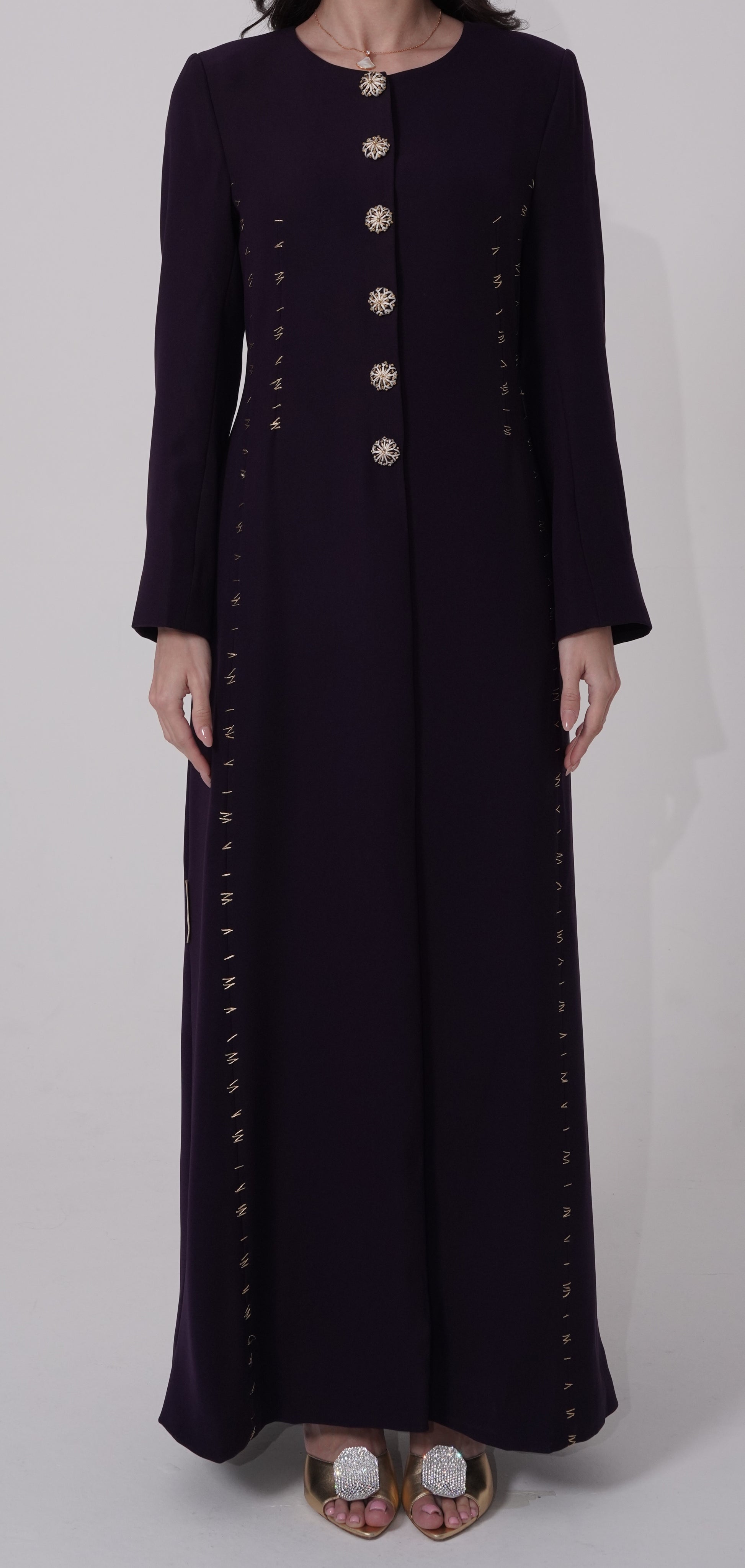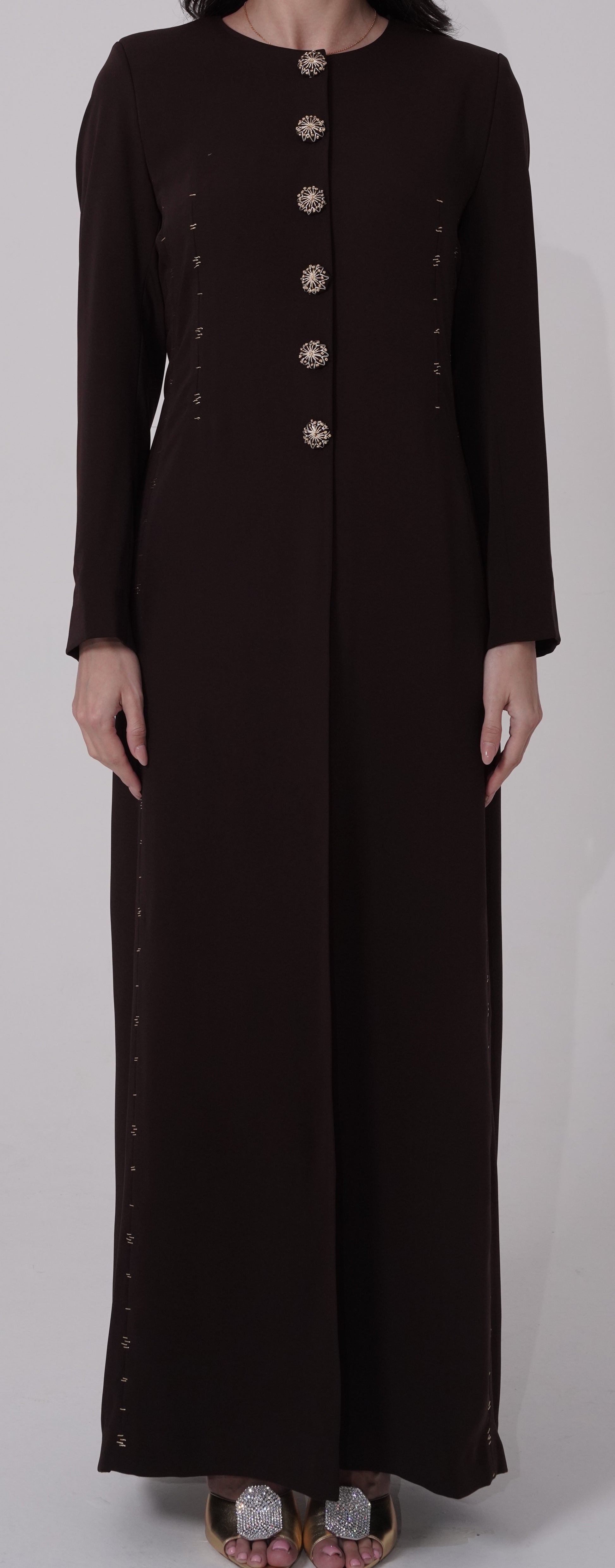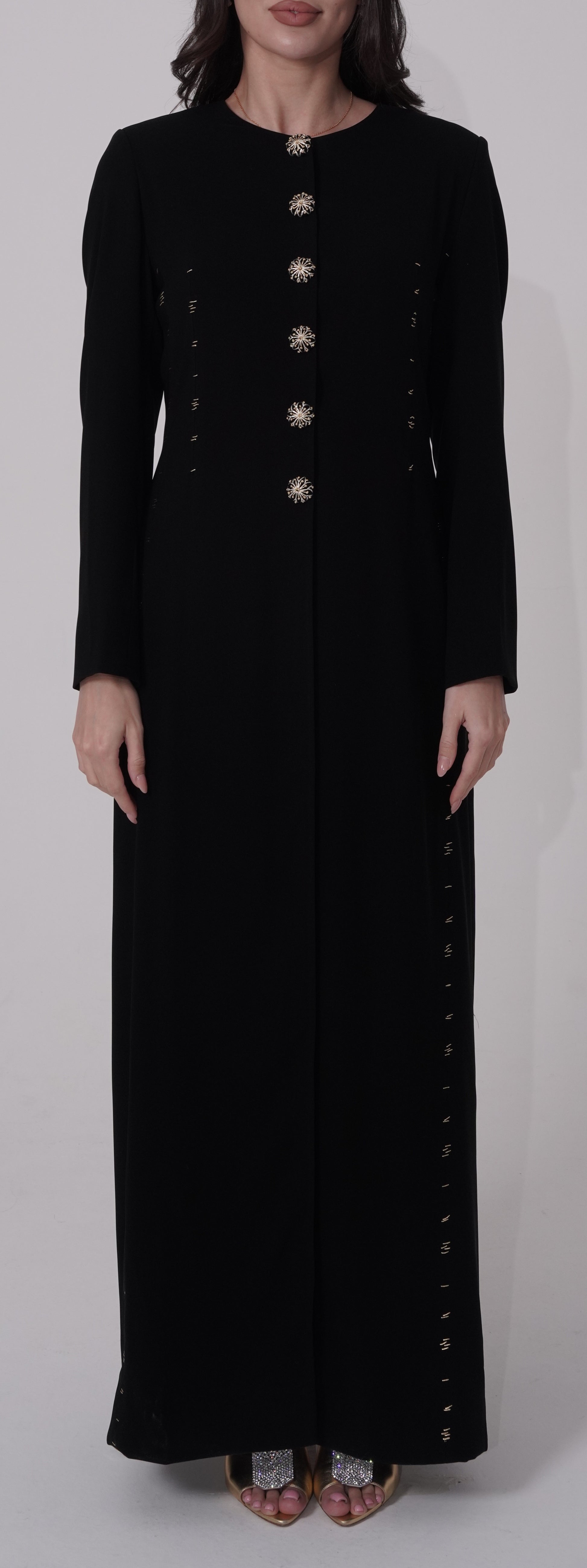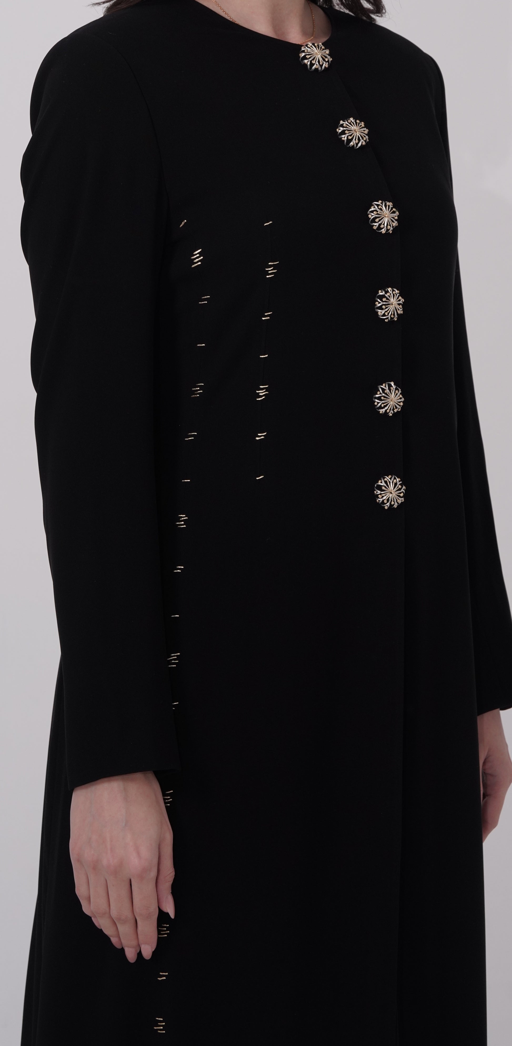 our Golden Touch abaya, crafted from premium lightweight fabric that drapes beautifully. Each piece features meticulous hand-embroidered details throughout, with exquisite embroidery adorning every button. The tailored fit cut ensures a flattering silhouette while maintaining modest elegance. Designed for comfort and sophistication, this fully handcrafted abaya combines traditional artistry with contemporary style, making it perfect for any occasion.